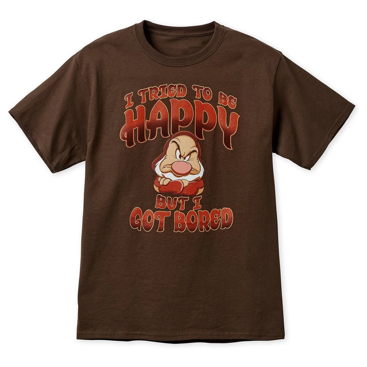 If your glass tends to run half empty, this Grumpy T-shirt is for you! Featuring screen art of the most cantankerous of the Seven Dwarfs paired with sarcastic messaging, this tee will hold your interest in spite of your sour disposition.