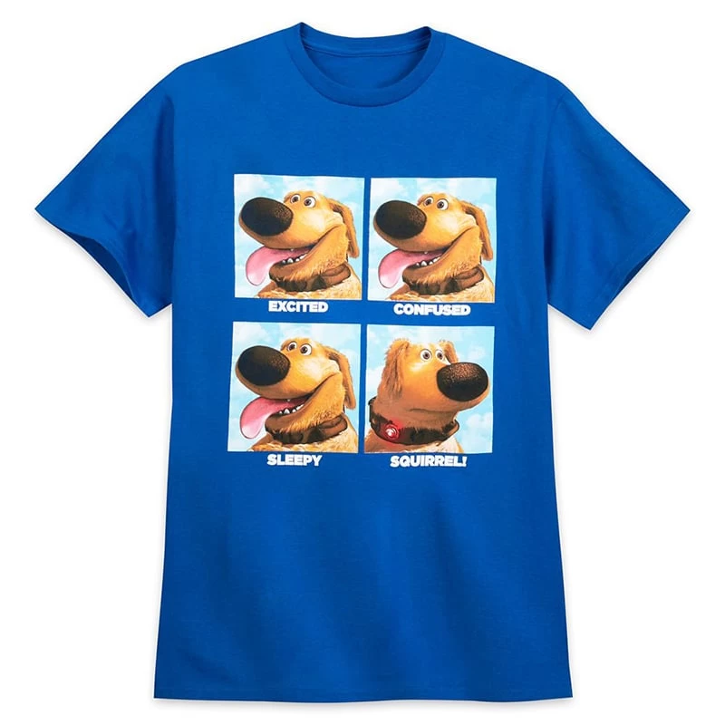 Passers-by will be distracted by your bright, bold tee showing four frames of delightfully dimwitted Dug the dog from Up. Only a wayward squirrel can make them turn away!