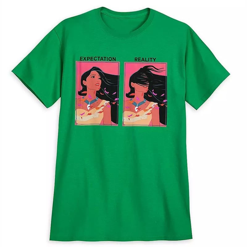 Compare expectation to reality in this ironic Pocahontas tee that turns the tables on optimistic Disney tradition with unexpected results.