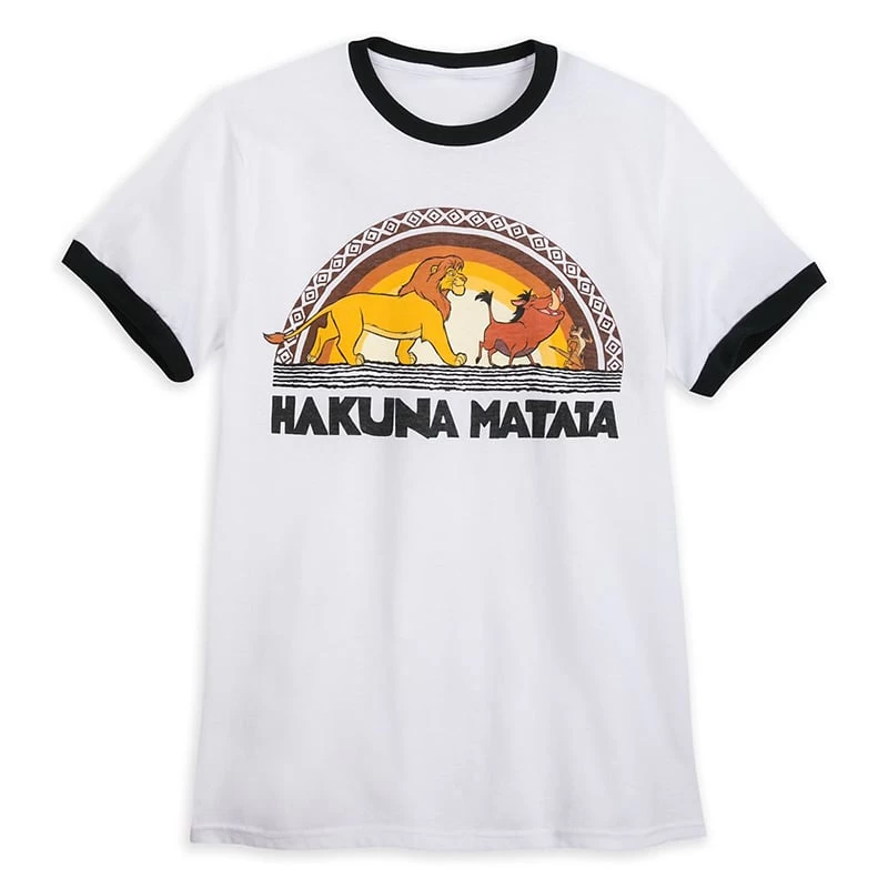 Simba, Pumbaa, and Timon are on the march with this problem-free ringer tee. Inspired by The Lion King, it features carefree retro art that makes your heart sing-out ”Hakuna Matata”.