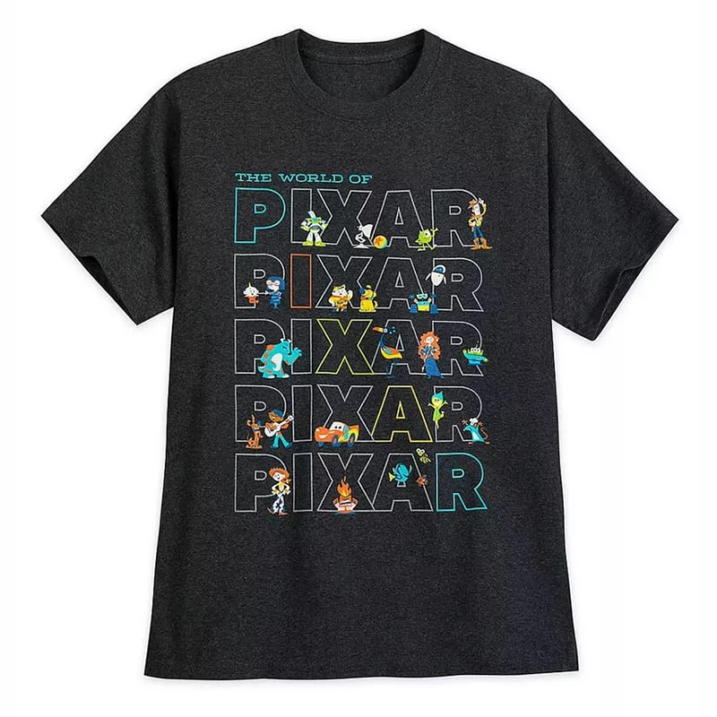Celebrate ”The World of PIXAR” with this tee featuring a colorful cast of characters from the company’s illustrious slate of movies. Buzz Lightyear, Sulley, Lightning McQueen, Merida, and Anger are found among the stacked pile of screen art ”PIXAR”s.