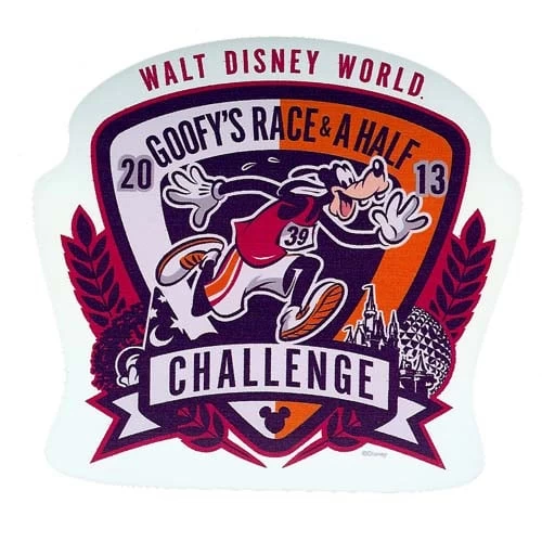 Celebrate the “20 Years Running” with the official 2013 Walt Disney World Goofy’s Race and a Half Challenge Crest Auto Magnet. The crest design displays the Walt Disney World 2013 Goofy’s Race and a Half Challenge run for your car, refrigerator, or any magnetic surface.