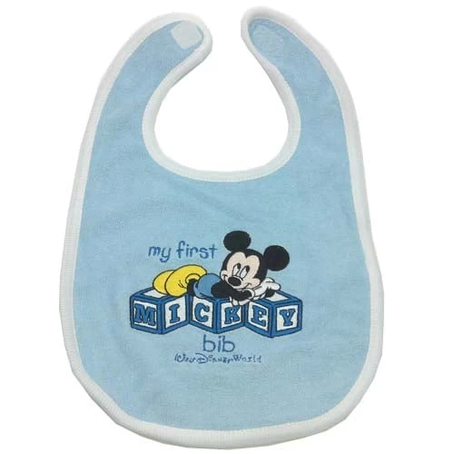 - Reads “My First Mickey Bib” with Mickey laying on blocks that spell out his name