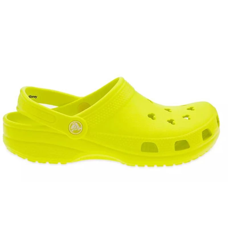 Stand out in the crowd when you rock these ultra comfy clogs for adults by Crocs. The neon yellow slide-on shoes feature Mickey icon-shaped ventilation holes for swell and stylish stepping.