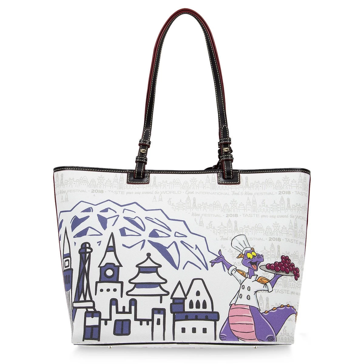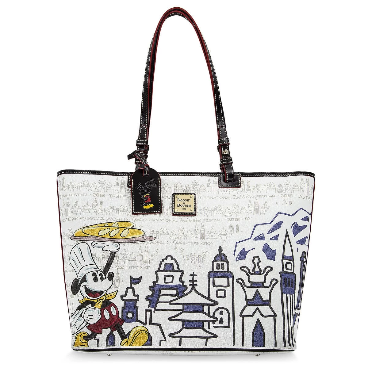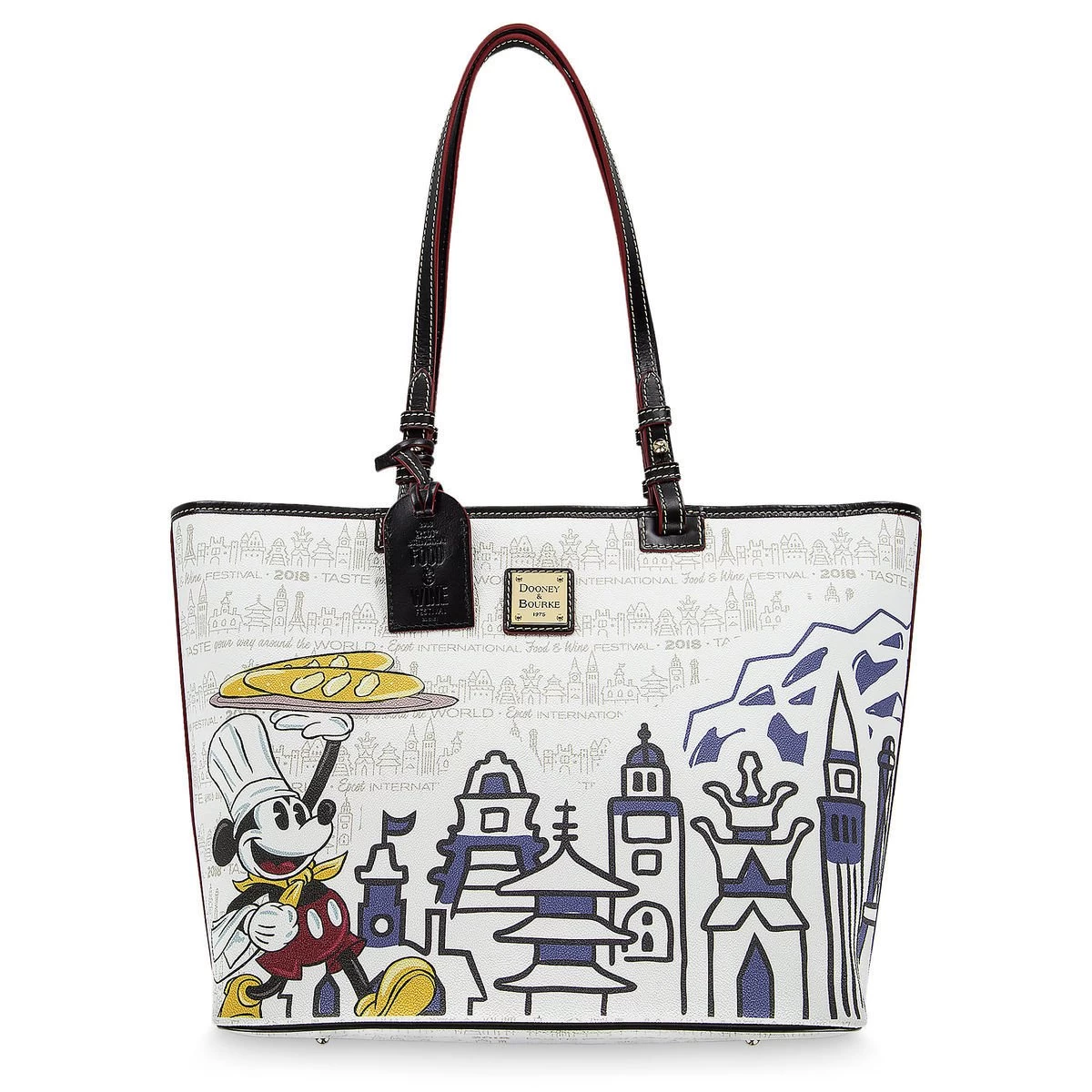 Savor your tasty adventures from the 2018 Epcot International Food & Wine Festival with this tote bag by Dooney & Bourke. Featuring screen art of Mickey and Figment paired with World Showcase icons, this bag makes for a sweet souvenir.