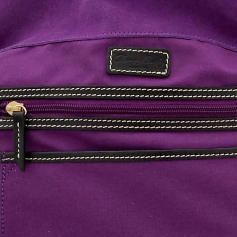 - Main compartment features zip closure with leather zip pull