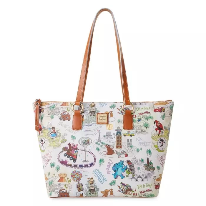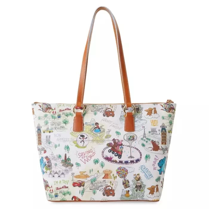 Take a fun trip to some of your favorite Pixar movies with this delightful tote from Dooney & Bourke. The colorful allover print on this spacious coated cotton bag features characters, locations, and landmarks including Pizza Planet, Radiator Springs, and Monster University.
