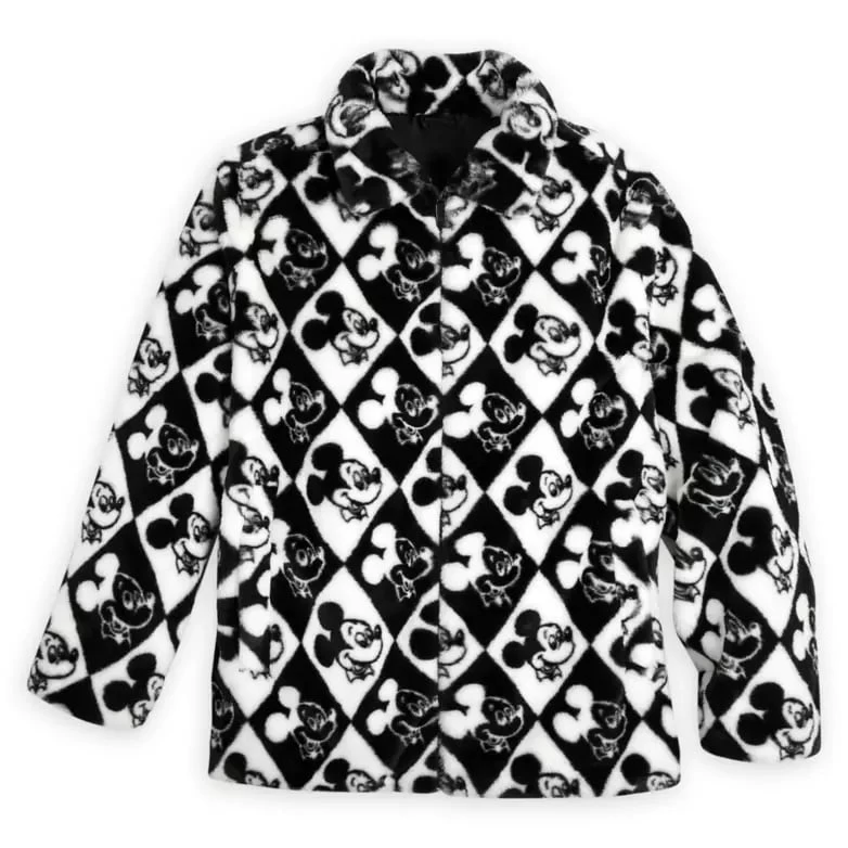 Mickey Mouse will warm your heart all through the winter months with this furry fleece jacket featuring allover ”diamond Mickey” pattern, zip front, collar and lining.