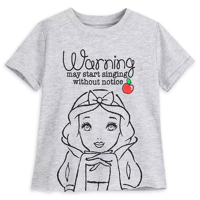Warning: you ”may start singing without notice” in this happy Snow White tee on heathered jersey knit. Whistle while you wear it!