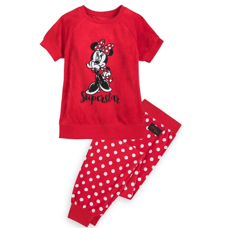 Snuggle-in with a superstar wearing Minnie’s soft velour pajama set featuring embroidered art and polka dot pants.