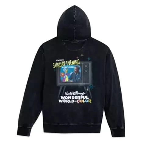 In the golden age of television, your hosts Walt Disney and Ludwig Von Drake visited on Sunday nights with Walt Disney’s Wonderful World of Color and now they’ll come along wherever you go in this pullover hoodie with mineral wash treatment and partially embroidered TV show logo. To be continued…