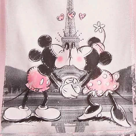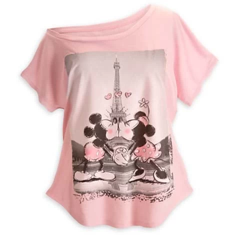 Get an eye-full of Mickey and Minnie on their visit to Paris with this tres chic tee for women that is designed to be worn off the shoulder. Rhinestone accents make it tres sparkling.
