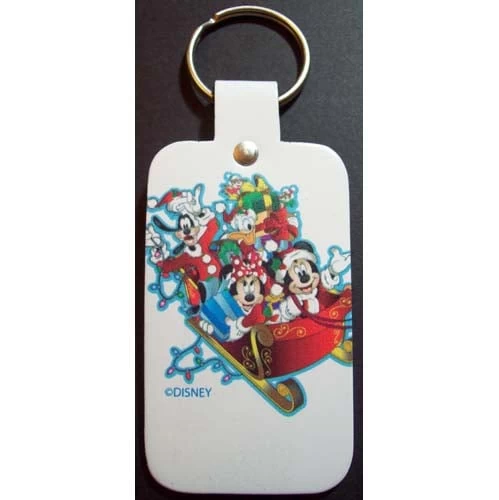 Wherever you may go, take your keys and Mickey and the Gang dressed in Christmas clothes and riding on a sleigh on this adorable keychain from Walt Disney World. This tag features Mickey Mouse, Donald Duck, Minnie Mouse, Chip and Dale, and Goofy all dressed in Christmas outfits and riding a sleigh with presents on it on a white background with the word “Disney” in the lower left corner. Also included on this tag is the “Disney” logo. This keychain includes a sturdy and durable key ring that is 1 1/4 inches in diameter.