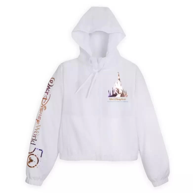 Keep ”The World’s Most Magical Celebration” going whenever you wear this commemorative Walt Disney World 50th Anniversary lightweight zip jacket. The white jacket features iridescent foil artwork on the front and sleeve, while the back cleverly spells out ”Walt Disney World” incorporating your favorite attractions!
