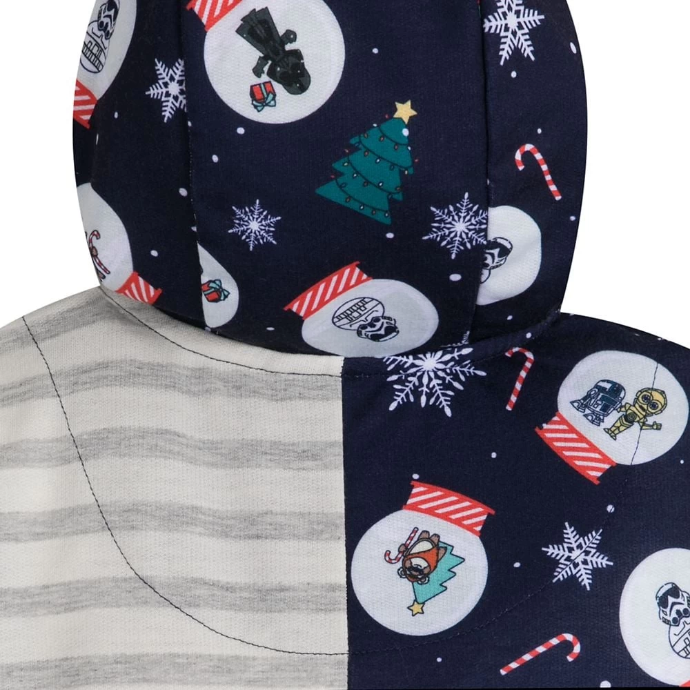 A galaxy of Star Wars characters get in the holiday spirit on this festive kids romper. Darth Vader, C-3PO, R2-D2, an Imperial Stormtrooper and an Ewok are featured inside snowglobes in the seasonal design of this comfy cotton hooded sleepwear that includes a holiday message from the dark side: ”Up to snow good for the holidays.”
