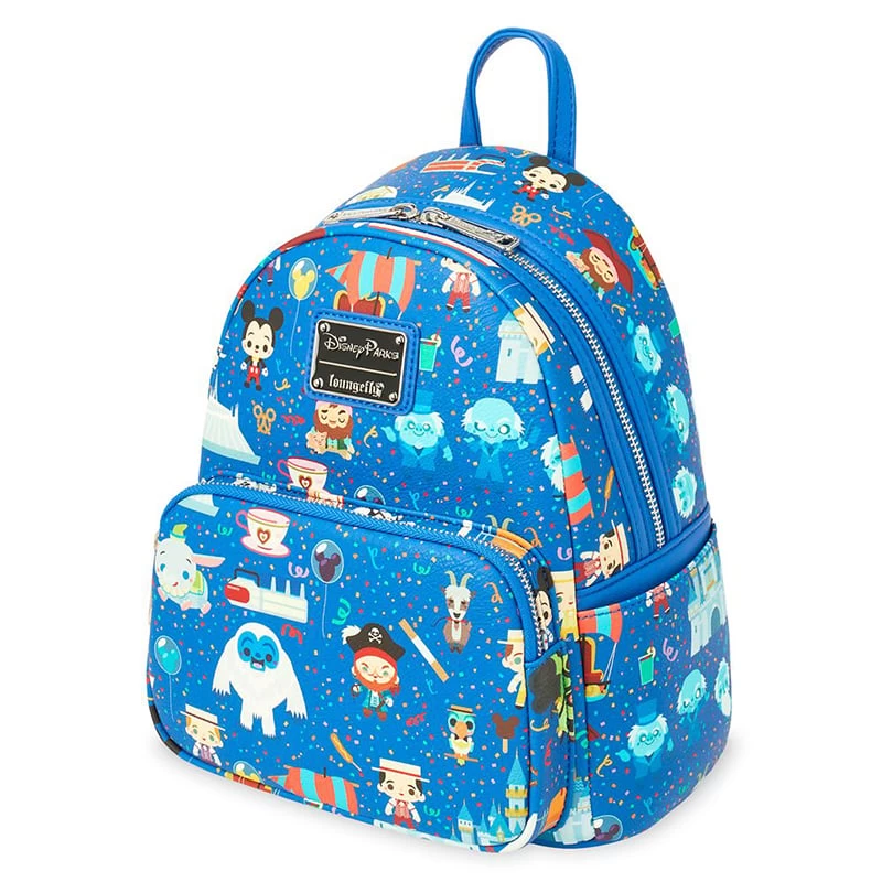 Mickey, the Hitchhiking Ghosts, Expedition Everest’s Yeti, and the Dapper Dans are among the characters and Disney Parks treats and attractions featured in the colorful allover Chibi-style print on this faux leather mini backpack by Loungefly.