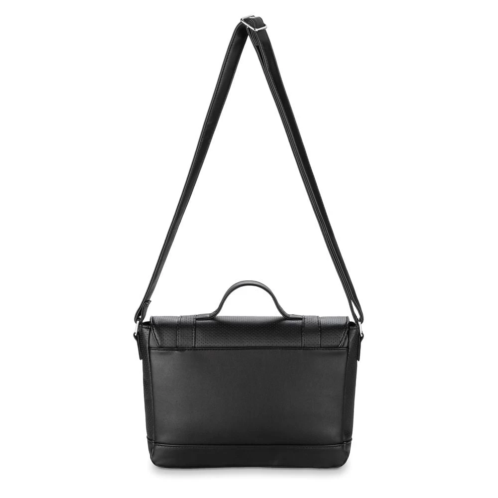 Mickey adds character to this stylish simulated leather messenger bag from Loungefly. Chrome Mickey icons form part of the buckle straps for the front flap while his name is featured in the bold red and black lining. The top carry handle and shoulder strap make it as versatile as it is elegant.