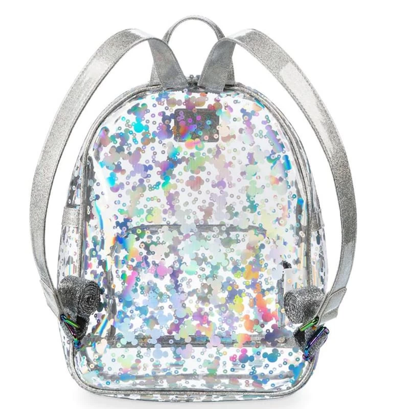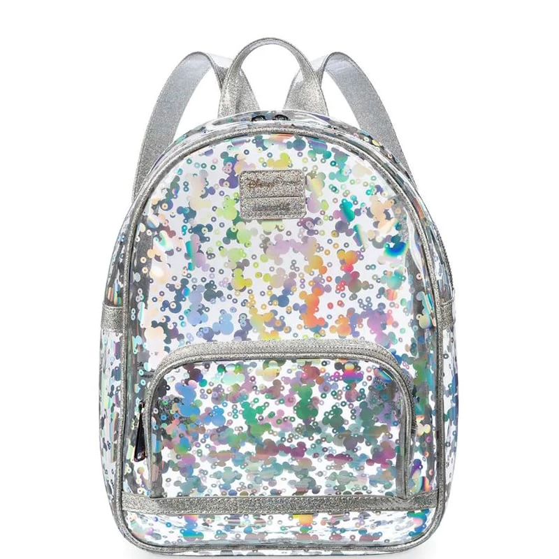 Join the transparency trend! Give the world a sneak peek at your carry-along essentials in this clear vinyl mini backpack covered with iridescent metallic Mickey icons and trimmed in iridescent silver glitter textile.