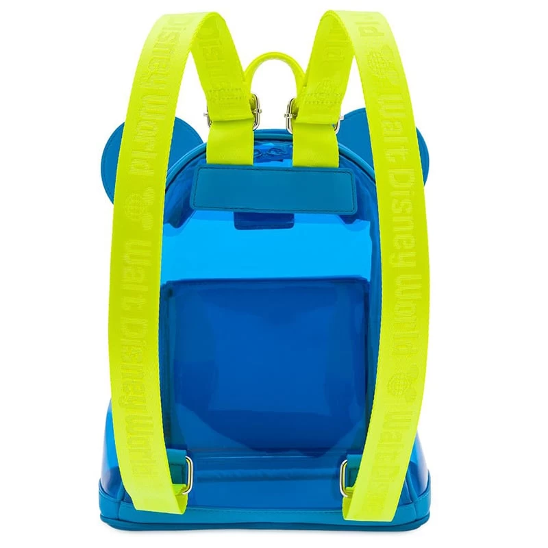 Mickey lets you take a peek inside this vibrant ”see-through” vinyl mini backpack complete with mouse ears and ”shorts” pouch. Neon straps are woven with the classic Walt Disney World logo.