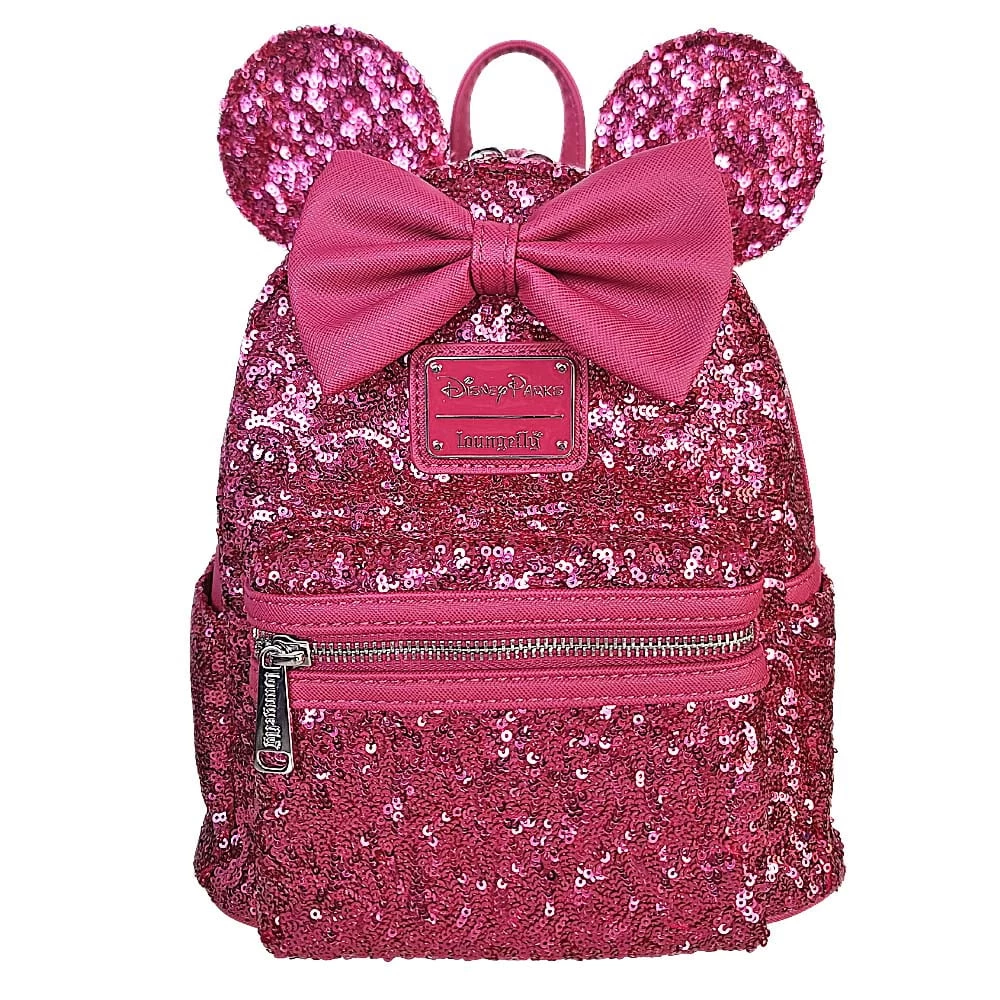 Imagine the compliments you’ll get on Loungefly’s compact Minnie Mouse mini backpack in Raspberry! The allover sequins and faux leather trim mean you’ll be on point with serious sparkle while toting around essentials in style.