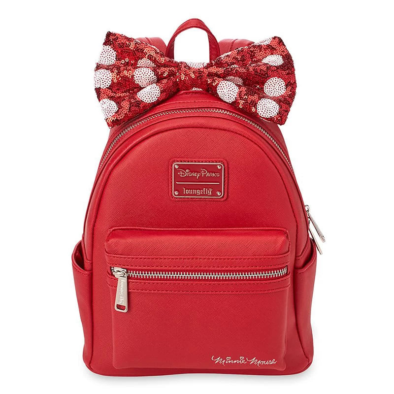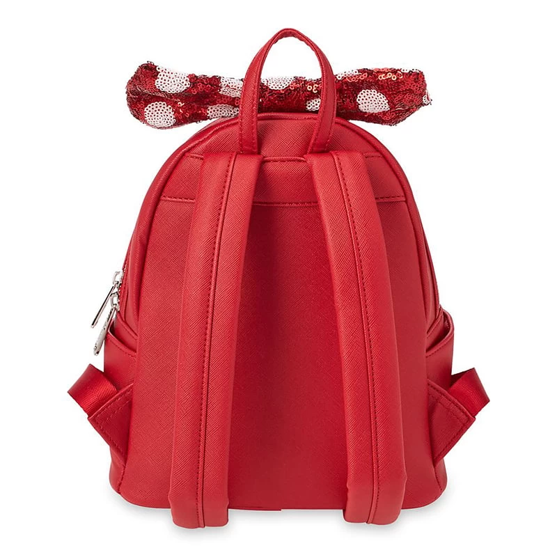 A sequined polka dot Minnie bow tops this simulated leather mini backpack by Loungefly. Accented by the ”signature” of the leading lady, it’s stylish, smart, and ready to rock.