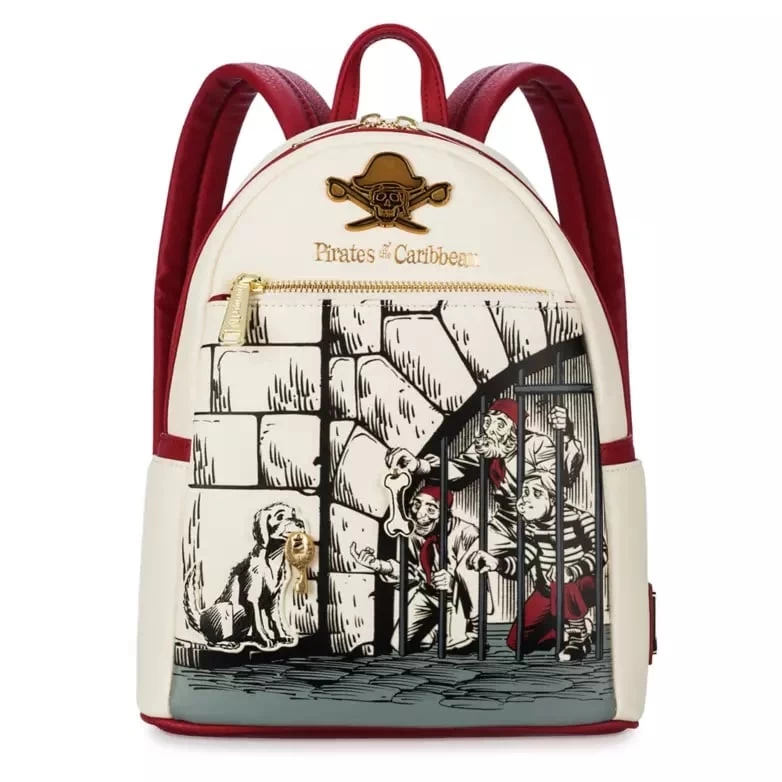 The prison dog taunts the prisoners with a dangling 3D goldtone key while they try tempting him with a juicy bone on this mini backpack by Loungefly. Inspired by the memorable scene in the Pirates of the Caribbean attraction, this simulated leather bag is perfect for carrying all your daily treasures!