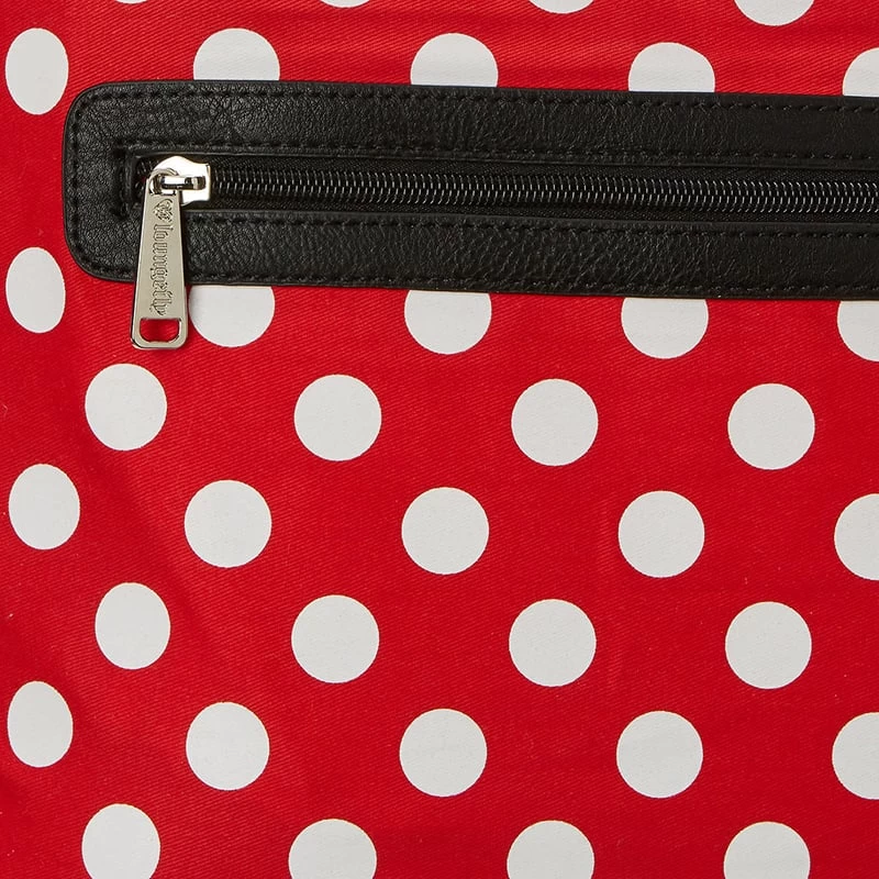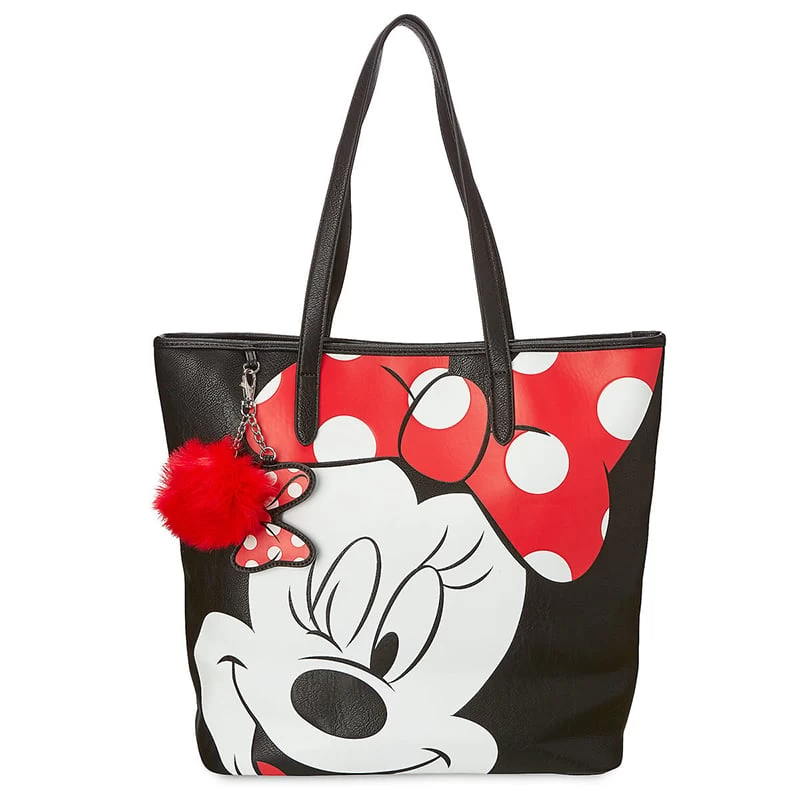 Show your Minnie Mouse style with this faux-leather tote from Loungefly featuring everyone’s favorite sweetheart. This handy bag features a big outside pocket and two more inside, plus fun ornament dangles of a minnie bow and a fuzzy plush ball.