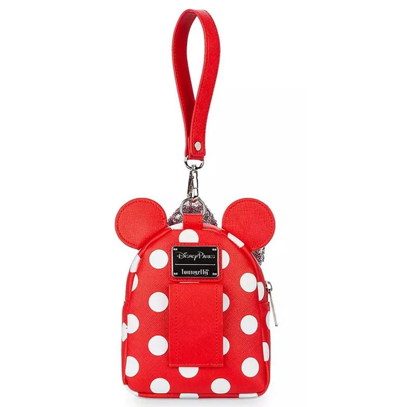 Keep your carry-along essentials close at hand in this simulated leather wrist pack from Loungefly that’s covered in polka dots and trimmed with Minnie Mouse ears and a sequined bow.