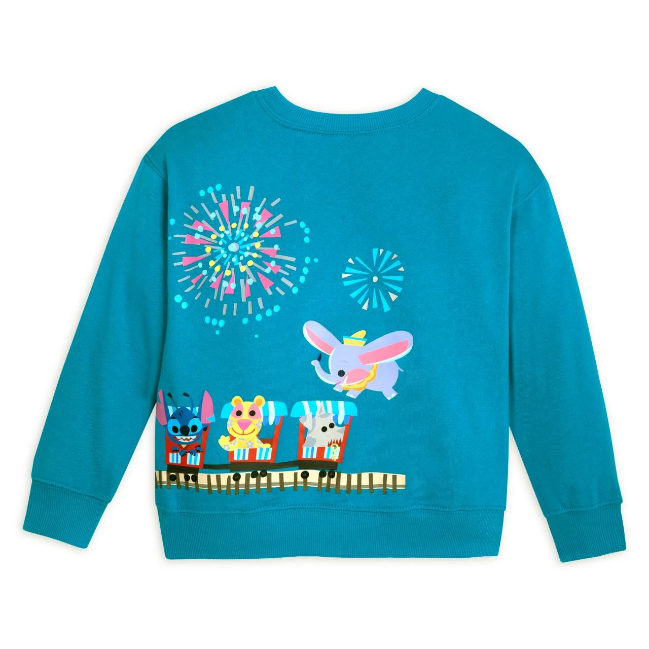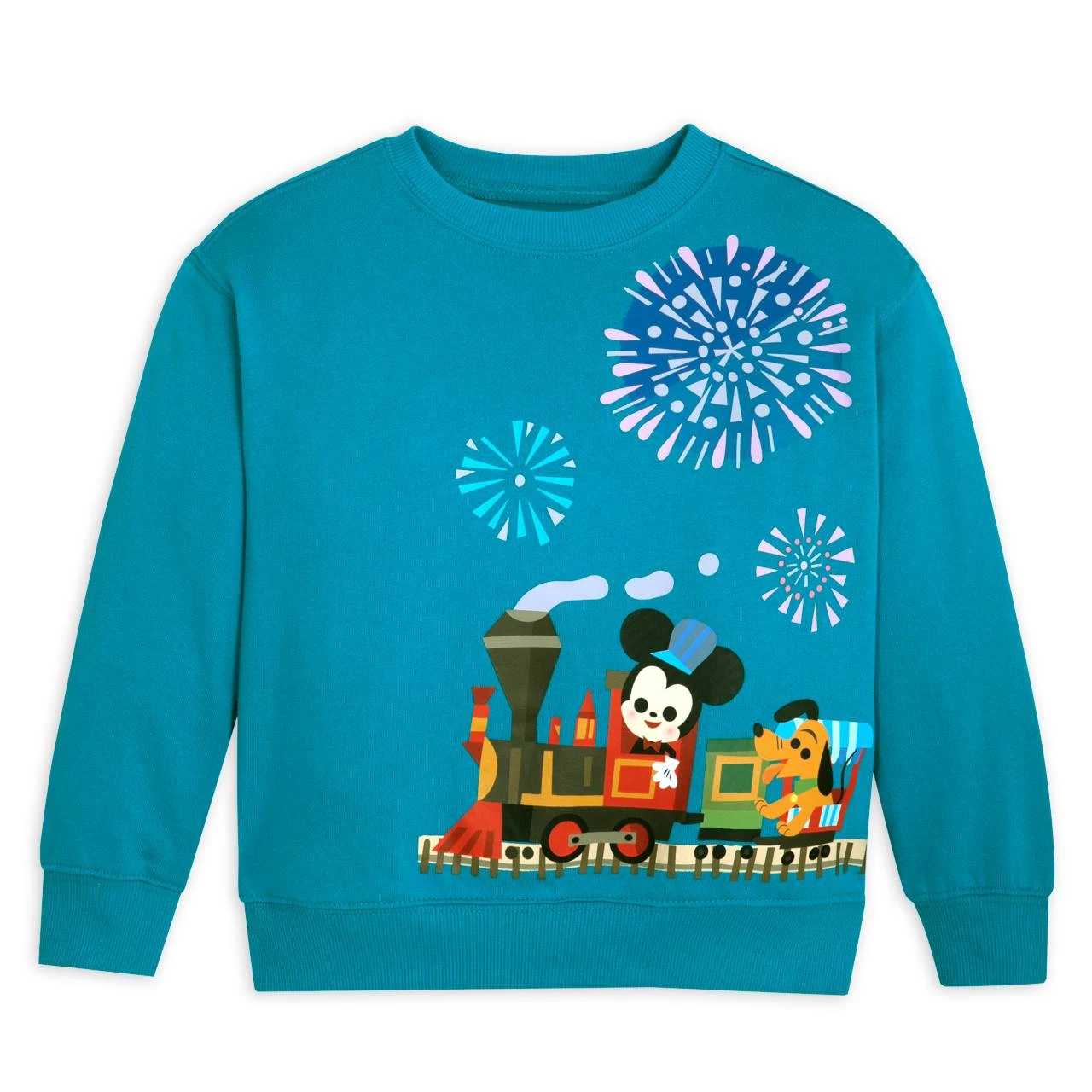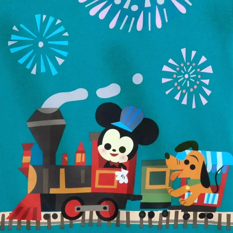 All aboard for a fun ride around this Disney Parks pullover sweatshirt created by artist Joey Chou. It’s full steam ahead with train driver Mickey who’s at the controls of the popular railroad attraction with its colorful collection of passengers while overhead there’s a brilliant firework display.