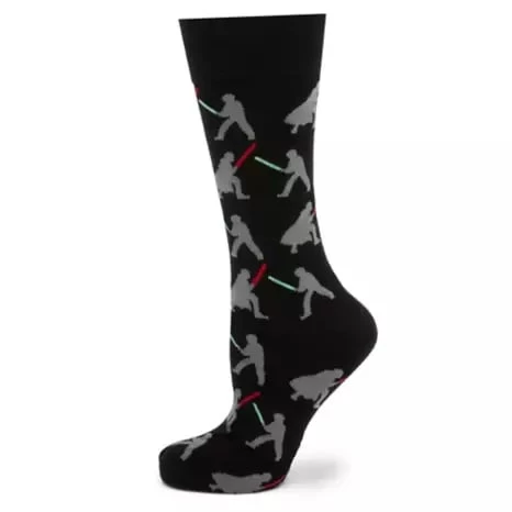 Take a walk on the dark side in these Star Wars socks featuring the epic Lightsaber duel between Darth Vader and Luke Skywalker. The red and green glow from their weapons stands out against the black background with the figures silhouetted in gray.