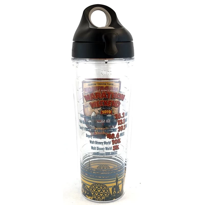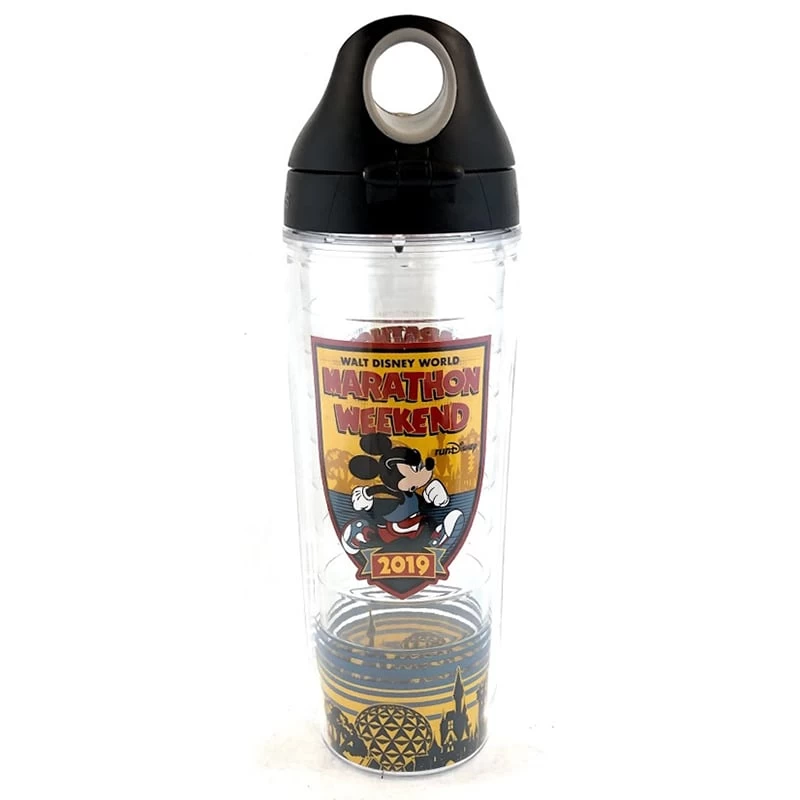 This Tervis water bottle commemorates the 2019 Walt Disney World Marathon. It features Mickey Mouse , the runDisney logo, and theme park icons.