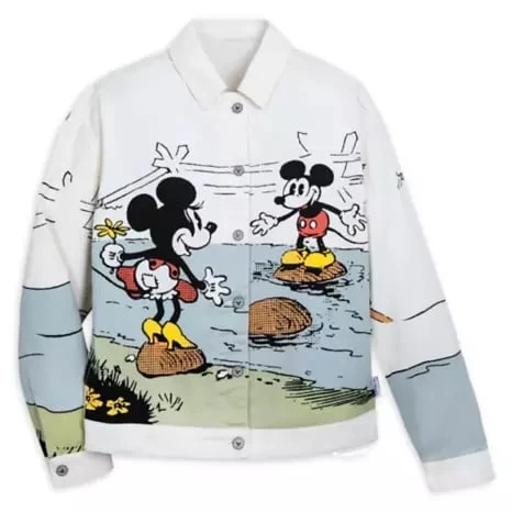 A match made in heaven: Mickey and Minnie and you in this fun, stylish jacket. Featuring big and bold vintage style art on the front, this Mickey and Minnie Mouse white denim jacket has all the classic jean jacket styling plus a lot more personality. Put in on and it’s true love forever.