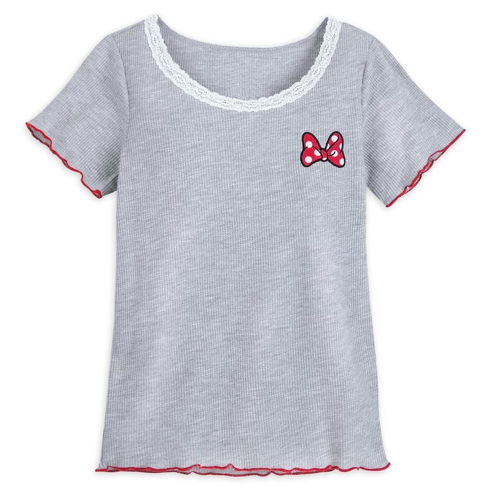 Fun meets fashion on this waffle-weave, short sleeve top inspired by Minnie Mouse! Accented with a polka dot appliqué on the chest, lace along the scoop neck, and red-edged lettuce hem, it embodies the playful style of our leading lady.