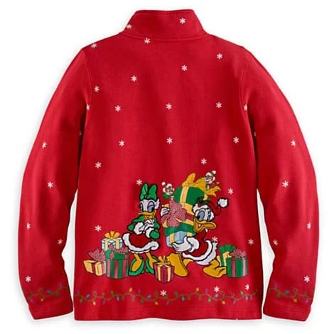 The gang’s gotten together for some holiday cheer! Celebrate along with them when you wear this snowflake-covered cadet-collar, fully zippered sweatshirt jacket featuring Santa Mickey, Minnie, Daisy, and Donald!