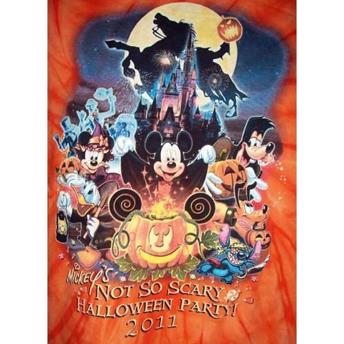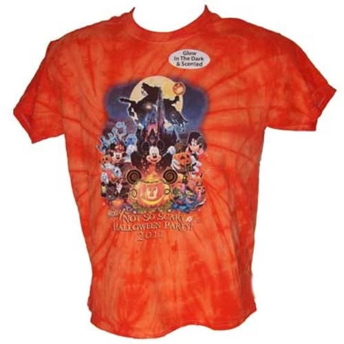 This is the unique design for the Mickey’s Not So Scary Halloween Party held at Disney every year. This shirt is only available at the event and at no other time. This shirt is orange and is scented as well as has a picture that glows in the dark. The picture on the front of the shirt is of the characters Mickey Mouse, Minnie Mouse, Goofy, Pluto, Donald Duck and Stitch. Mickey is dressed as a vampire, Minne as a witch, Goofy as Frankenstein, Pluto as himself, Donald as the grave-keeper, and Stitch as Captain Barbosa. Below the picture are the words “Mickey’s Not So Scary Halloween Party! 2011” in orange and white letters.